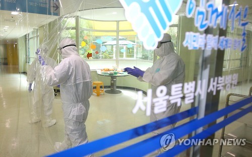 | △ 음압병동 들어가는 의료진 (서울=연합뉴스) 김도훈 기자 = 14일 오후 중동호흡기증후군(메르스) 노출자 진료병원인 서울시 은평구 서북병원에서 의료진이 환자의 엑스레이 촬영을 위해 검사실로 향하고 있다. 2015.6.14 superdoo82@yna.co.kr |