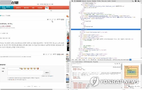 | △ HTML로 언론사 기사 조작 (이천=연합뉴스) 경기 이천경찰서는 15일 지역신문사 홈페이지에 접속, 기사를 임의로 조작해 중동호흡기증후군(메르스) 발생과 상관없는 병원에 의심환자가 발생한 것처럼 기사를 유포한 혐의(명예훼손 및 업무방해)로 대학생 오모(21)씨를 불구속 입건했다. 오씨는 지난 2일 이천지역 A신문사 홈페이지에 개발자 모드로 접속, 4월 30일자 경기도 행사 기사의 HTML(Hypertext Markup Language) 소스코드를 조작해 "이천 B병원에 메르스 의심환자가 나왔다. 이천시 관계자가 이 같은 사실을 밝혔다"는 등 허위사실을 유포한 혐의를 받고 있다. 2015.6.15 <<이천경찰서>> you@yna.co.kr |