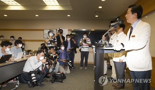 | △ 기자회견하는 송재훈 병원장 (서울=연합뉴스) 윤동진 기자 = 14일 오전 서울 강남구 서울삼성병원 암병원에서 열린 기자회견에서 송재훈 삼성서울병원 병원장이 중동호흡기증후군(메르스)과 관련된 병원 방침을 말하고 있다. 송 원장은 이날 기자회견에서 "이날부터 신규 외래·입원 환자를 한시적으로 제한하며 응급수술을 제외하고는 수술과 응급진료도 한시 중단한다"고 밝혔다. 2015.6.14 mon@yna.co.kr |