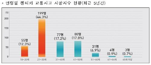 렌터카 교통사고 사망자 10명 가운데 5∼6명은 30세 이하 운전자가 가해자인 셈이다.