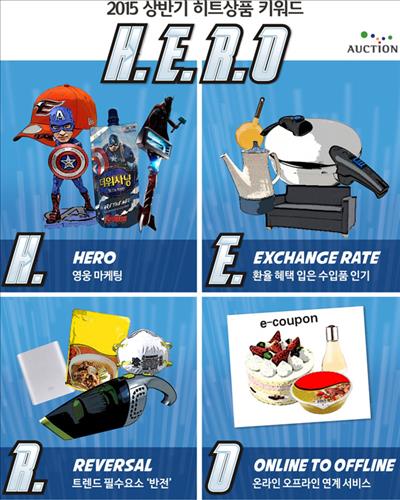 (서울=연합뉴스) 이도연 기자 = 온라인 쇼핑사이트 옥션(www.auction.co.kr)은 올해 상반기 온라인 쇼핑을 주도한 핵심 키워드로 '영웅 마케팅(Hero)'을 선정했다고 15일 밝혔다.