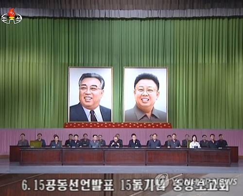 | △ 북한, 6·15공동선언 15주년 기념 중앙보고회 (서울=연합뉴스) 북한은 15일 조선중앙TV를 통해 방영한 '6·15공동선언 발표 15주년 기념 중앙보고회'에서 이날 발표한 '공화국 정부 성명'에 대해 남한 정부가 관계회복을 원하면 이에 호응해야 한다고 촉구했다. 북한은 이날 6·15 남북공동선언 발표 15주년을 맞아 김정은 체제 들어 두 번째로 정부 성명을 발표하고 남한 정부와 대화·협상을 할 용의를 내비쳤다. 2015.6.15. nkphoto@yna.co.kr |