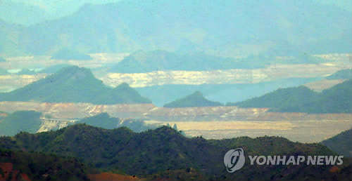 | △ 바닥드러낸 북한 금강산댐 상류 (화천=연합뉴스) 이상학 기자 = 18일 강원 중부전선 최전방에서 바라본 북한 금강산댐 상류가 최근 가뭄으로 인해 바닥을 드러내고 있다. 2015.5.18 hak@yna.co.kr |