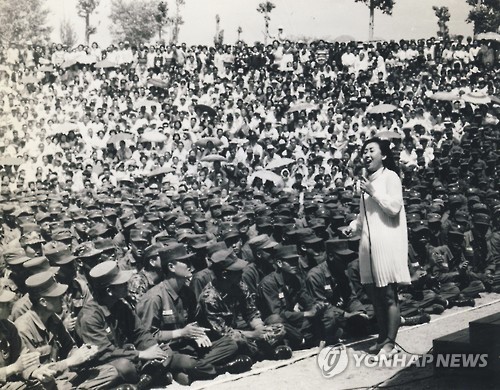 | △ <광복 70년> 대중문화 70년 (서울=연합뉴스) 1945년 광복과 함께 우리 말과 노래도 해방되자 대중문화는 척박한 땅에서 꽃을 피웠다. 70년을 담금질한 대중문화는 지금 세계인을 사로잡는 한류의 첨병으로 K-웨이브를 이끌고 있다. 4·19혁명과 5·16군사정변과 함께 시작된 1960년대는 대중문화가 가요를 중심으로 싹을 틔우던 시기다. 1961년 한명숙의 '노란 샤쓰의 사나이'를 시작으로 최희준, 현미, 패티김 등 미8군쇼 출신 가수들이 한 축을 담당하며 다채로운 장르가 출현했다. 사진은 원로가수 한명숙 씨의 군 위문공연 시절 모습. 2015.6.16 << 대중음악평론가 박성서 씨 제공.연합뉴스DB >> photo@yna.co.kr |