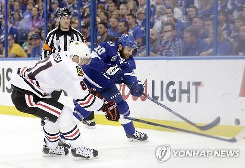| △ 북미 아이스하키리그(NHL) 챔피언 결정전 5차전에서 시카고 블랙혹스 마리안 호사(왼쪽)와 템파베이 라이트닝 브렌든 마로우가 승부를 겨루고 있다. (AP=연합뉴스) |
