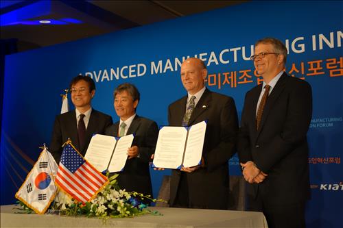 <사진 : LS산전이 16일 미국 배전반 전문기업 SAI와 양해각서(MOU)를 체결하고 현지 전력 시장 공략에 나섰다. 산업부 이관섭 제1차관, LS산전 이학성 부사장, SAI 최고경영자(CEO) 브래드 벨, 미 상무부 브루스 앤드루스 부장관(왼쪽부터) 등이 MOU 체결 후 사진을 찍고 있다.>
