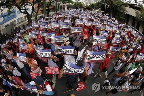 | △ 6월 12일 필리핀에서 열린 반 중국 시위. 이들은 중국의 남중국해 영유권 주장에 대해 항의했다.(EPA=연합뉴스) |