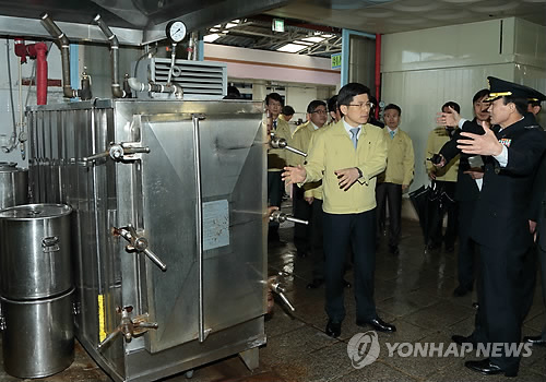 | △ 지난 4월14일 당시 황교안 법무부 장관이 경기도 안양교도소를 방문, 수용시설 관리 실태와 재난대응 시스템을 점검하는 모습(연합뉴스 자료사진) |