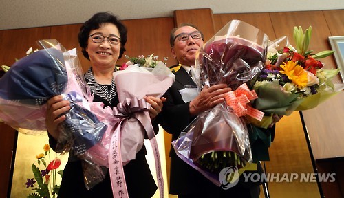 | △ 꽃다발 한아름 받은 이성대씨 부부 (부산=연합뉴스) 김선호 기자 = 16일 오전 11시 30분 부산 수영구 주부산일본국총영사 관저에서 고 이수현씨의 부친인 이성대 LSH 아시아장학회 명예회장과 부인 신윤찬씨가 일본 정부의 훈장인 '욱일쌍광장'과 꽃다발을 받은 뒤 기념사진을 찍고 있다. 2015.6.16 wink@yna.co.kr |
