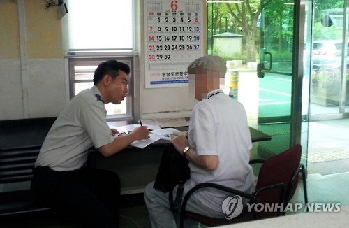 | △ 지구대를 찾아온 영국 할아버지 (성남=연합뉴스) 알츠하이머(노인성 치매)에 걸린 80대 영국인 할아버지가 아내가 세상을 떠났다는 사실을 기억하지 못하고 지구대를 찾아가 아내를 찾아달라고 도움을 요청한 사실이 알려져 가슴을 뭉클하게 만들고 있다. 지난 15일 오전 서현지구대를 찾아온 영국 할아버지(81) 모습. 2015.6.16 <<서현지구대>> you@yna.co.kr |