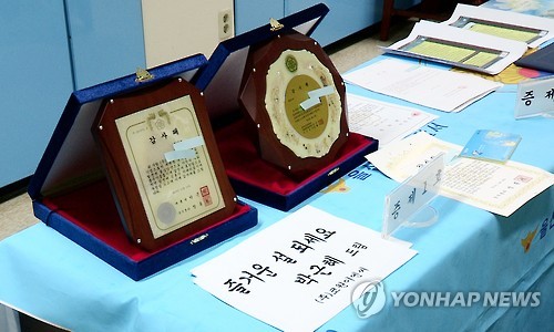 | △ 위조된 대통령 명의 감사패 (울산=연합뉴스) 김근주 기자 = 울산 울주경찰서는 대통령 측근 행세를 하며 돈을 뜯어낸 혐의(사기)로 이모(53)씨를 구속했다고 17일 밝혔다. 이씨가 사람들을 속이기 위해 위조한 대통령 명의의 감사패. 2015.6.17 canto@yna.co.kr |