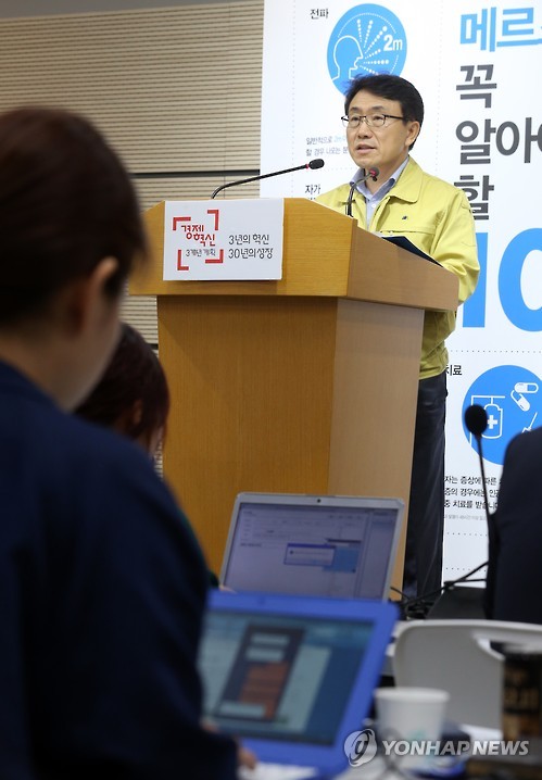 | △ 브리핑하는 권덕철 총괄반장 (세종=연합뉴스) 배재만 기자 = 권덕철 중앙메르스관리대책본부 총괄반장이 16일 오전 정부세종청사 보건복지부 공용브리핑룸에서 열린 중동호흡기증후군(메르스) 정례 브리핑에서 메르스 유가족에 심리상담 지원 등 내용을 브리핑하고 있다. 2015.6.16 scoop@yna.co.kr http://blog.yonhapnews.co.kr/f6464 |