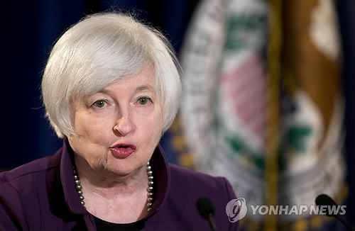 | △ 미국 연준 기준금리 동결 (워싱턴 AP=연합뉴스) 재닛 옐런 미국 연방준비제도(연준) 의장이 17일(현지시각) 워싱턴에서 연방공개시장위원회(FOMC) 정례 회의가 끝난 뒤 기자회견을 하고 있다. 연준은 이날 '미국 경제가 올해 초 슬럼프 이후 강화됐으나 금리를 인상하기 전에 노동시장이 더 개선되고 인플레이션율이 더 높아지는 것을 보길 원한다'고 밝혔다. ciy@yna.co.kr |
