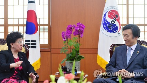 | △ 마가렛 찬 사무총장 만난 윤병세 장관 (서울=연합뉴스) 황광모 기자 = 마가렛 찬 세계보건기구(WHO) 사무총장과 윤병세 외교부 장관이 18일 오후 서울 도렴동 외교부 청사에서 환담을 나누고 있다. |