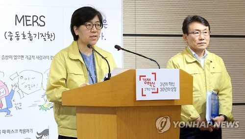 | △ 메르스 정례 브리핑 (세종=연합뉴스) 배재만 기자 = 정은경 중앙메르스관리대책본부 현장점검반장이 18일 오전 정부세종청사 보건복지부 공용브리핑룸에서 열린 중동호흡기증후군(메르스) 정례 브리핑에서 메르스 환자 현황에 대해 설명하고 있다. 오른쪽은 권덕철 총괄반장. 2015.6.18 scoop@yna.co.kr http://blog.yonhapnews.co.kr/f6464 |
