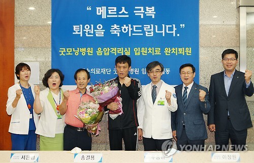 | △ 메르스 완치 퇴원 "이겨낼 수 있습니다" (평택=연합뉴스) 18일 중동호흡기증후군(메르스)을 이겨내고 경기도 평택굿모닝병원을 퇴원하는 송길용(왼쪽에서 3번째), 우종하(왼쪽에서 4번째)씨가 평택굿모닝병원 이장원 병원장(오른쪽에서 3번째), 공재광 평택시장(오른쪽)가 함께 메르스를 이겨낼 수 있다고 외치고 있다. (평택굿모닝병원 제공) |