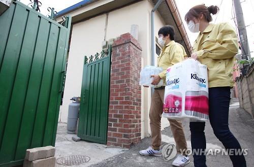 | △ 자택격리자 집에 생필품 지원하는 공무원들 <<연합뉴스 DB>> |