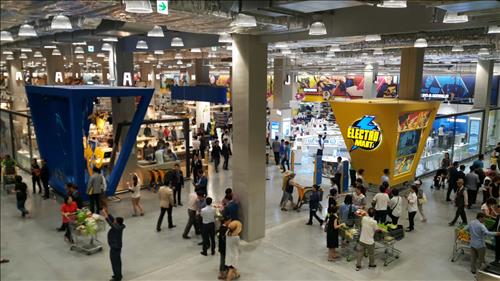 가전매장인 지하 1층 일렉트로마트는 '일렉트로맨'이라는 영웅 캐릭터를 매장 곳곳에 활용해 유쾌한 분위기를 자아냈다. 점원들도 일렉트로맨이 그려진 티셔츠를 입고 있었다.