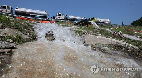 | △ 남한강 물로 마른 저수지 물 채우기 (여주=연합뉴스) 신영근 기자 = 극심한 가뭄이 계속되는 가운데 18일 오전 경기도 여주시 대신면 옥촌저수지에서 수자원공사가 남한강 물을 담은 물탱크 차량으로 바닥을 드러낸 저수지에 물을 채우고 있다. drops@yna.co.kr http://blog.yonhapnews.co.kr/geenang |