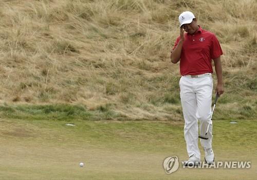 | △ 지난해 US아마추어오픈골프대회 우승자인 양건(21)이 18일(현지시간) 미국 워싱턴 주 체임버스베이 골프클럽에서 막을 올린 제115회 US 오픈 골프대회 1라운드 18번 홀에서 트리플 보기를 범한 뒤 아쉬움을 나타내고 있다. (AP=연합뉴스) |