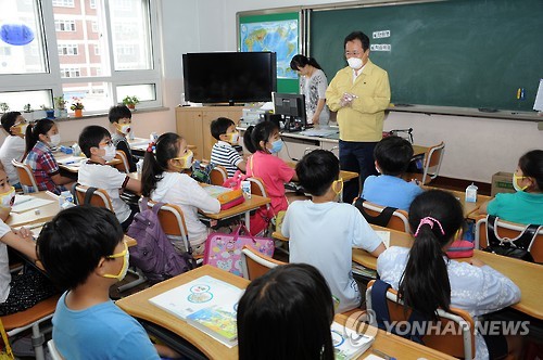| △ (부산=연합뉴스) 김석준 부산시교육감이 18일 3일간의 휴업을 끝내고 문을 연 한 초등학교를 방문, 학생들에게 메르스 감염예방 요령을 설명하고 있다. 2015.6.18 << 부산시교육청 >> youngkyu@yna.co.kr |