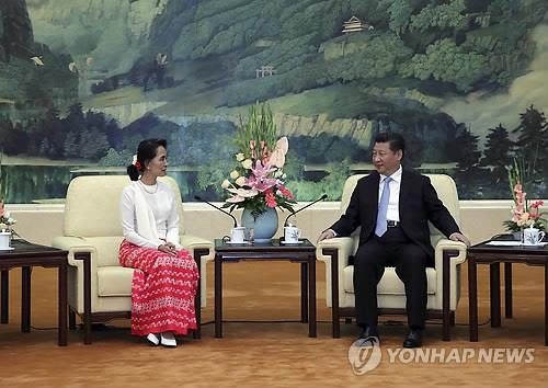 | △ (베이징 AP=연합뉴스 자료사진) 미얀마 민주화 운동의 상징인 아웅산 수치 여사가 지난 11일 중국 베이징 인민대회당에서 시진핑 중국 국가주석과 만나고 있다. |