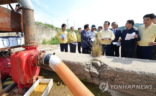 | △ 가뭄 현장 찾은 김관용 경북도지사 (대구=연합뉴스) 김관용 경북도지사(가운데)가 19일 가뭄 피해가 심한 울진군과 영덕군을 찾았다. 영덕군 강구면 오십천에서 양수작업 상황을 살펴보고 있다. 2015.6.19 <<경북도 제공>> |