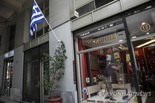 | △ 그리스 "협상 결렬시 유로존 탈퇴" (아테네 AP=연합뉴스) 야니스 스투르나라스 그리스 중앙은행 총재는 17일(현지시간) 의회에서 (구제금융) 협상 결렬시 채무불이행(디폴트)에 이어 결국 유로존에서 탈퇴하게 될 것이라고 밝혔다. 그리스는 유로존 재무장관 협의체인 유로그룹 회의에서 구제금융 분할금 72억 유로 지원 등을 위한 개혁안을 놓고 협상 중이다. 채권단은 그리스가 지난 14일 제시한 대안이 미흡하다며 연금 삭감 등을 요구했으나 그리스 정부는 대안을 새로 제시하지 않겠다고 맞서고 있다. 그리스는 오는 30일 국제통화기금(IMF에 16억 유로를 상환해야 하며 7~8월에는 유럽중앙은행(ECB)에 67억 유로를 갚아야 한다. 사진은 이날 아테네 중심가에서 한 남성이 상점 윈도우 안 쪽을 청소하는 모습. bulls@yna.co.kr A man sweeps behind a shop window in Athens, Greece, on Wednesday, June 17, 2015. Athens must pay 1.6 billion euros ($1.8 billion) off its debts at the end of the month to avoid a possible default and secure its cherished place among the 19 countries using the single currency.(AP Photo/Yorgos Karahalis) |