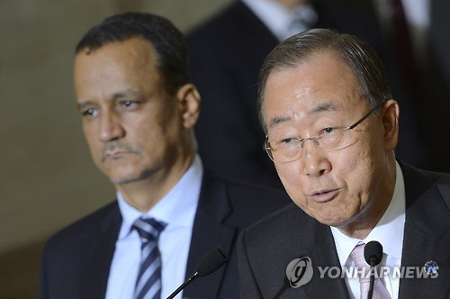 | △ (AP= 연합뉴스 사진자료) 제네바에서 예멘 평화회담 시작한 반기문 유엔 사무총장과 이스마일 울드 셰이크 아흐메드 유엔 예멘 특사의 모습. |