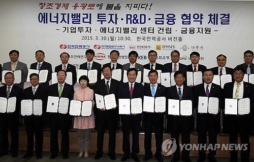 | △ 광주전남혁신도시 기업유치 등 협약 (무안=연합뉴스) 이낙연 전남지사와 조환익 한전 사장, 신정훈 국회의원, 강인규 나주시장 등이 30일 광주전남혁신도시 한전 비전홀에서 기업유치와 에너지밸리 건립 협약을 체결했다. 2015.3.30 <<전남도 제공>> shchon@yna.co.kr |