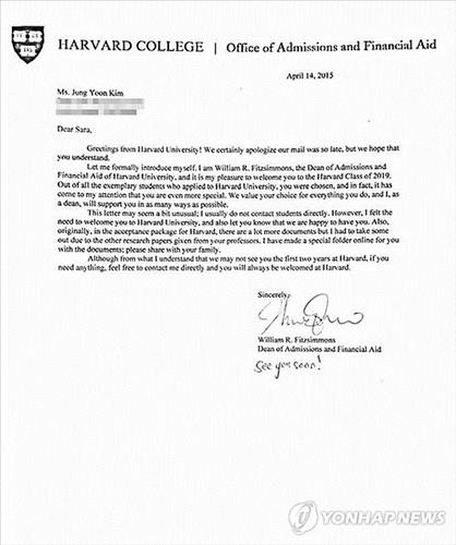 | △ 하버드·스탠퍼드대 "한국 여고생 합격 사실 아니다" (워싱턴=연합뉴스) 노효동 특파원 = 미국의 명문 하버드 대학과 스탠퍼드 대학에 동시 진학했다는 미국 유학 여고생 김정윤(18)양의 주장에 대해, 하버드 대학본부의 공보담당자는 9일(현지시간) "김양 가족이 제시한 합격통지서는 위조(forgery)된 것"이라고 답변했다. 2015.6.10 << 김정윤양 가족 제공 >> |