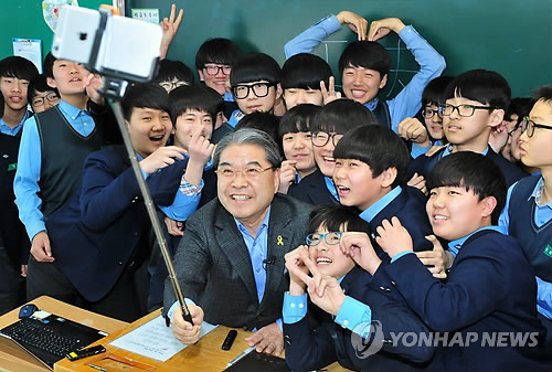| △ '셀카봉'으로 중학생들과 사진 찍는 '이재정 선생님'(연합뉴스 자료사진) |