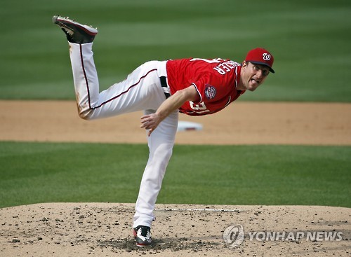 | △ (AP=연합뉴스) 미국프로야구 워싱턴 내셔널스 맥스 셔저가 21일(한국시간) 미국 내셔널스파크에서 피츠버그 파이리츠전에 등판해 공을 던지고 있다. |