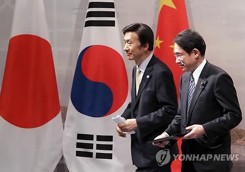 | △ 올해 3월 서울에서 열린 한중일 외교장관회의때 나란히 걸어가는 윤병세 외교부 장관(왼쪽)과 기시다 후미오 일본 외무상(EPA.연합뉴스.자료사진) |