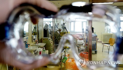 | △ 병원 관계자가 환자를 간호하는 모습이 방호복 고글을 통해 보이고 있다.(연합뉴스 자료사진) |