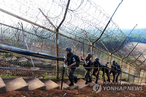 | △ 긴장감 흐르는 동부전선 (고성=연합뉴스) 이종건 기자 = 6·25전쟁이 일어난 지 65년이 됐으나 남북이 대치하는 전선에는 한시도 늦출 수 없는 팽팽한 긴장감이 24시간 흐르고 있다. 동부전선 최전방에서 경계작전에 투입된 육군 22사단 장병이 철책의 이상 여부를 점검하고 있다. 2015.6.21 momo@yna.co.kr |
