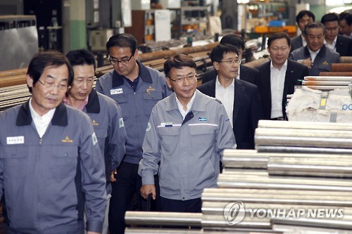 | △ 협력사 찾은 김명우 두산중공업 사장 (서울=연합뉴스) 두산중공업이 올해부터 협력사 사정을 가장 잘 아는 사업부문장들이 동반 성장 업무를 직접 챙긴다고 21일 밝혔다. 두산중공업에 따르면 그간 최고경영진 위주로 진행되던 동반성장 활동에 내실을 기하기 위해 올해부터는 각 사업부문장이 직접 협력사를 찾아가 애로 사항을 들고 해소 방법을 찾는 등 경쟁력 강화방안을 모색하는 활동을 펼치고 있다. 김명우 두산중공업 사장(왼쪽 네번째)이 부산 사하구에 위치한 협력사 화신볼트산업을 방문해 생산현장을 둘러보며 관계자에게 설명을 듣고 있다. 2015.6.21 << 두산중공업 제공 >> photo@yna.co.kr |