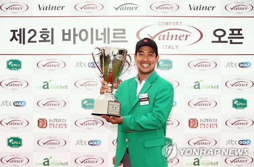 | △ 바이네르오픈 우승 차지한 박재범 (서울=연합뉴스) 21일 제주시 오라 컨트리클럽에서 열린 KPGA 투어 바이네르오픈 대회에서 우승을 차지한 박재범이 트로피를 들고 포즈를 취하고 있다. 2015.6.21 << KPGA 제공 >> photo@yna.co.kr |