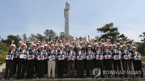 | △ 대한민국 6.25 참전유공자회 서울 금천구지회 회원들이 현충일을 앞둔 지난 4일 한국전쟁 전적지 중 한 곳인 충북 충주시 탄금대 '팔천고혼 위령탑'을 찾아 한국전쟁 국군포로 송환을 북한에 촉구하는 퍼포먼스를 하고 있다. |