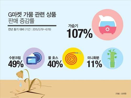 G마켓 소형가전팀 손형술 팀장은 "덥고 건조한 날씨가 지속되면서 실내에서 건조함을 느낀 사람들이 가습기나 수분크림 등 수분 공급 상품을 많이 찾고 있다"며 "특히 농촌 지역에서 극심한 가뭄을 겪으면서 가뭄에 대응할 수 있는 스프링클러나 호스 등의 상품군도 판매 증가세를 보이는 것 같다"고 전했다.