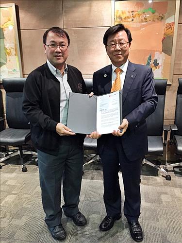 | △ 지난 19일 싱가포르 육상교통청 청사에서 열린 싱가포르 T3008 프로젝트 계약 서명식에서 오두환 GS건설 인프라부문 대표(오른쪽)와 추아총켕 싱가포르 LTA 부사장(왼쪽)이 계약서에 서명 후 기념 촬영하고 있다. GS건설 제공. |