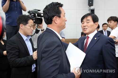 | △ 청주시의회서 이야기하는 지방의원들 (청주=연합뉴스) 김형우 기자 = 새누리당의 청주시 새 상징마크(CI) 단독 처리에 반발해 온 청주시의회 새정치연합 의원들과 새누리당 소속 김병국 의장(오른쪽) 22일 오전 청주시의회 본회의장에서 이날 개회하는 제1회 정례회 의사일정과 관련해 이야기하고 있다. 2015.6.22 vodcast@yna.co.kr |