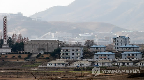 | △ 북한 기정동 마을 뒤로 보이는 개성공단 (판문점=연합뉴스) 임헌정 기자 = 12일 판문점 인근에서 바라본 북한 기정동 마을 뒤로 개성공단이 보이고 있다. 2014.11.12 kane@yna.co.kr |