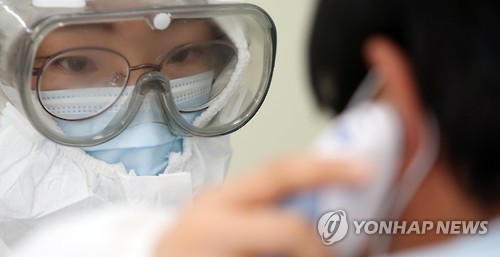 | △ 지난 10일 오산한국병원에서 방역복과 고글을 착용한 의료진이 메르스 확산을 막고자 체온을 측정하는 모습.(연합뉴스 자료사진) |