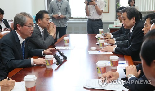 | △ 임종룡, 새누리당 부산지역 의원들과 경쟁력강화방안 간담회 (서울=연합뉴스) 진성철 기자 = 임종룡 금융위원장이 22일 국회에서 열린 '거래소 경쟁력 강화 방안 국회 간담회'에서 새누리당 김무성 대표, 나성린, 김세연 의원들 부산지역 의원들과 간담회를 갖고 있다. 2015.6.22 zjin@yna.co.kr |