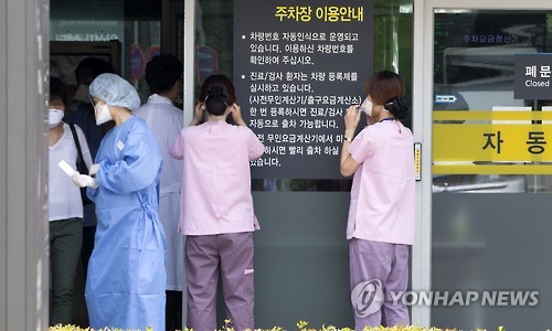 | △ 마스크 착용하는 의료진 (서울=연합뉴스) 윤동진 기자 = 중동호흡기증후군(메르스) 사태가 장기화 국면에 접어든 가운데 22일 오후 강남구 삼성서울병원 의료진이 주차장에 설치된 메르스 대응 시설물에 들어서기 위해 마스크를 착용하고 있다. 2015.6.22 mon@yna.co.kr |