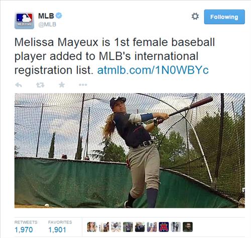 MLB닷컴과 미국 언론은 프랑스의 18세 이하 야구 청소년 국가대표팀 소속으로 유격수를 보는 멜리사 마이외가 MLB 국제 선수로 등록됐다고 22일(현지시간) 전했다.