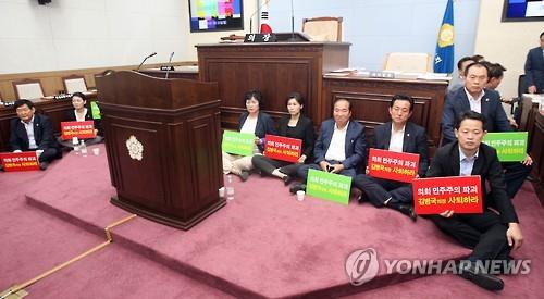 | △ 지난 22일부터 본회의장 의장석 주변 단상에서 농성을 벌이고 있는 새정치민주연합 청주시의원들. <<연합뉴스 DB>> |