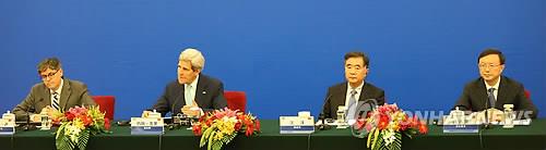| △ 지난해 7월 중국 베이징에서 열린 미중전략경제대화 후 폐막 기자회견에 참석한 양국 대표들. 왼쪽부터 미국의 제이컵 루 재무장관, 존 케리 국무장관, 중국의 왕양 부총리, 양제츠 국무위원. (AP=연합뉴스 자료사진) |