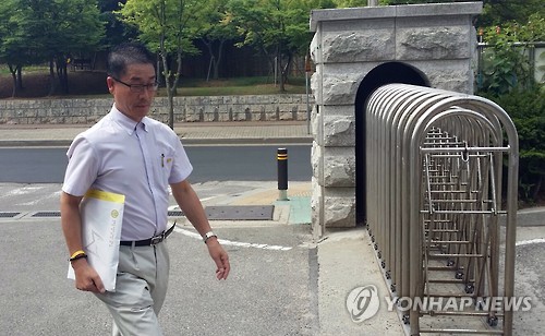 | △ 단원고 희생 김초원 교사 아버지 김성욱씨 (안산=연합뉴스) 이영주 기자 = 세월호 희생 단원고 기간제교사 김초원(당시 26세)씨의 아버지 김성욱(57)씨가 23일 오전 10시께 안산 단원고를 방문해 순직인정 신청서를 제출했다. 사진은 제출서류를 갖고 학교 정문으로 걸어 들어가는 김씨의 모습. 2015.6.23 young86@yna.co.kr |